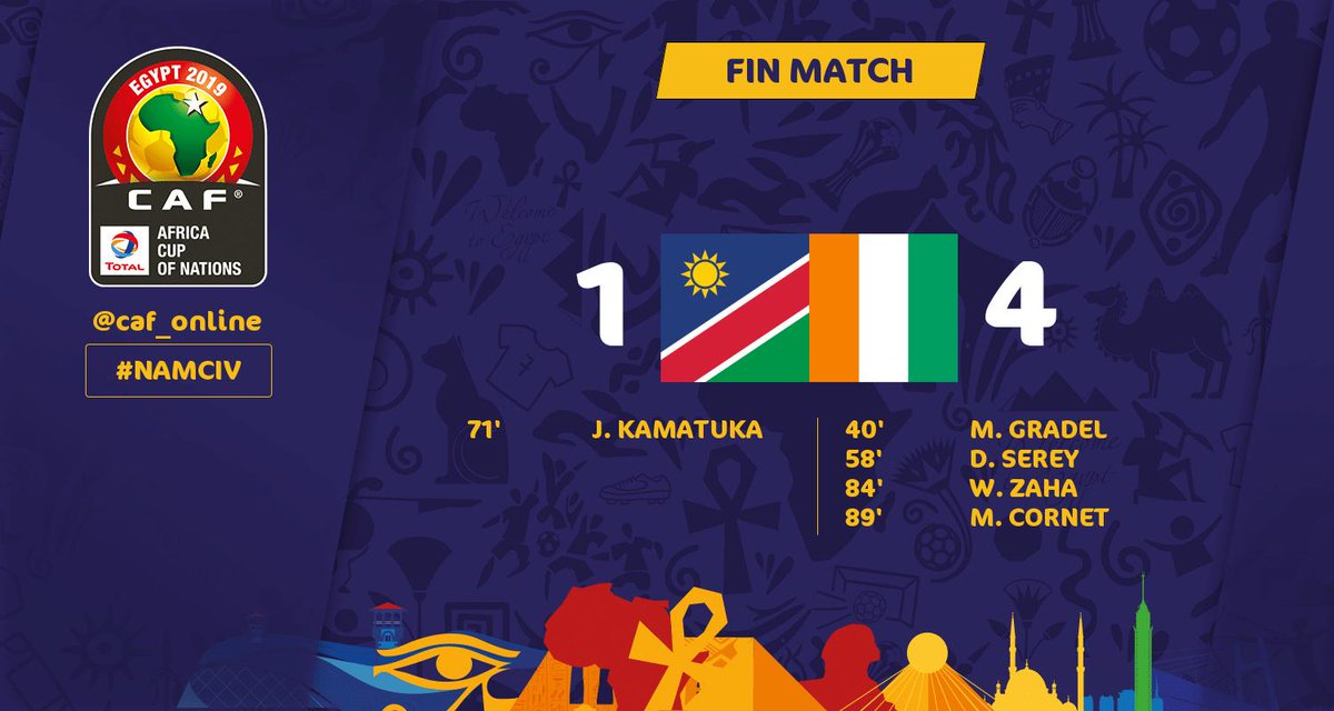 Dans les premiers instants de la partie, c’est pourtant bien la Namibie qui s’offrait les situations les plus dangereuses. Sylvain Gbohou devait ainsi sortir une belle parade sur cette frappe de Shalulile (25e). Mais peu à peu, les Ivoiriens prenaient le dessus, et Gradel allait ouvrir le score d’une belle reprise de volée devant le portier rival (0-1, 39e). Au retour des vestiaires, les Ivoiriens voulaient plier la rencontre rapidement, et c’est Serey Dié qui allait faire le break (0-2, 58. L’expérimenté milieu de terrain faisait trembler les filets namibiens d’une lourde frappe lointaine, déviée par un rival. La Namibie parvenait tout de même à réduire l’écart d’un joli plat du pied (1-2, 71e), mais Zaha, servi par Kessié, redonnait deux buts d’avance aux siens (1-3, 84e). Cornet pliait définitivement le match (1-4, 89e). La Côte d’Ivoire verra les huitièmes !