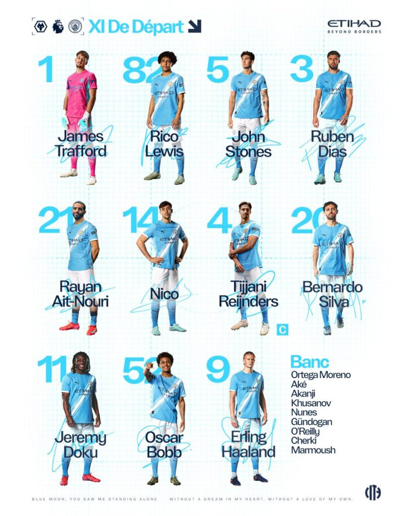 En face, Guardiola a tranché et opte pour un 4-2-3-1. Rayan Cherki démarre la partie sur le banc des remplaçants. Rayan Ait-Nouri est bien titulaire dans le couloir gauche face à son ancien club. Erling Haaland est quant à lui bien présent en attaque.