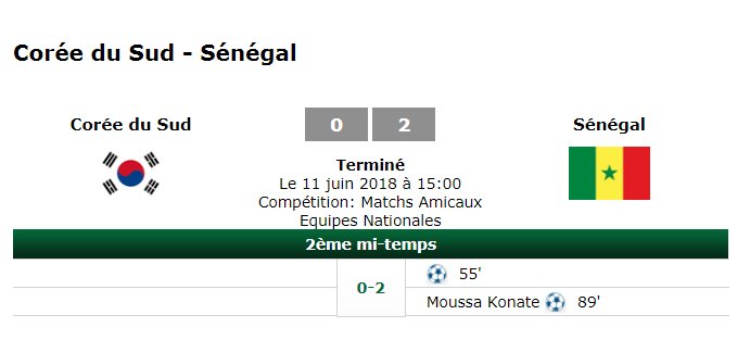 L’équipe nationale de football du Sénégal a battu celle de la Corée du Sud, 2-0, ce lundi, en match de préparation en direction de la Coupe du monde (14 juin au 15 juillet), a appris l’APS de sources concordantes.