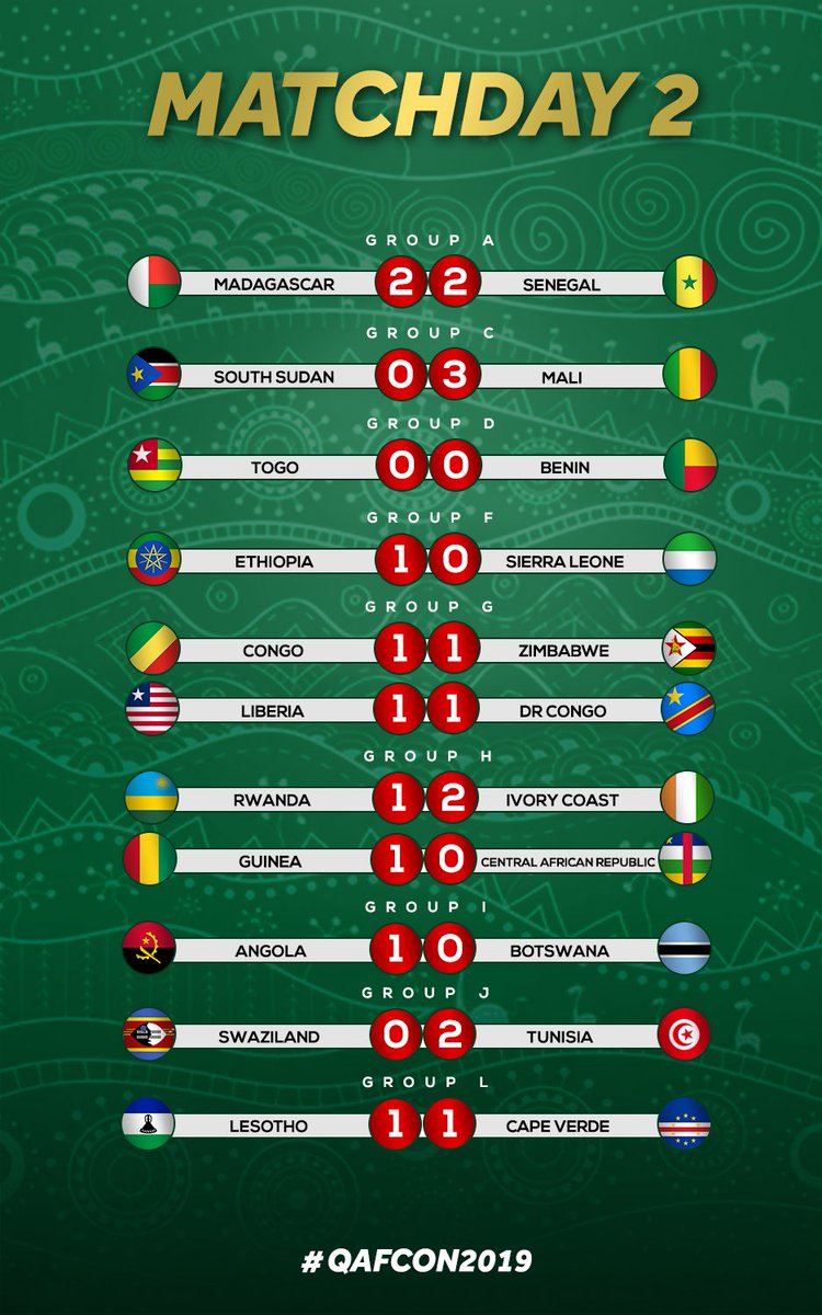 • Les compteurs ont été remis à zéro dans le Groupe F lors de la deuxième journée. Battus en juin dernier lors de la journée inaugurale, l’Éthiopie s’est remise en scelle face à la Sierra Leone (1-0), alors que le Kenya a pris le meilleur sur le Ghana (1-0).